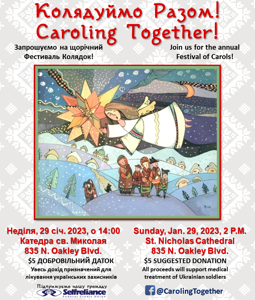 Сердечно запрошуємо Вас завітати на щорічний традиційний Різдвяний фестиваль "Колядуймо разом", який цього року відбудеться у неділю, 29-го січня 2023 року о 2 годині дня у Катедрі святого отця Миколая за адресою 835 N Oakley Blvd, Chicago.