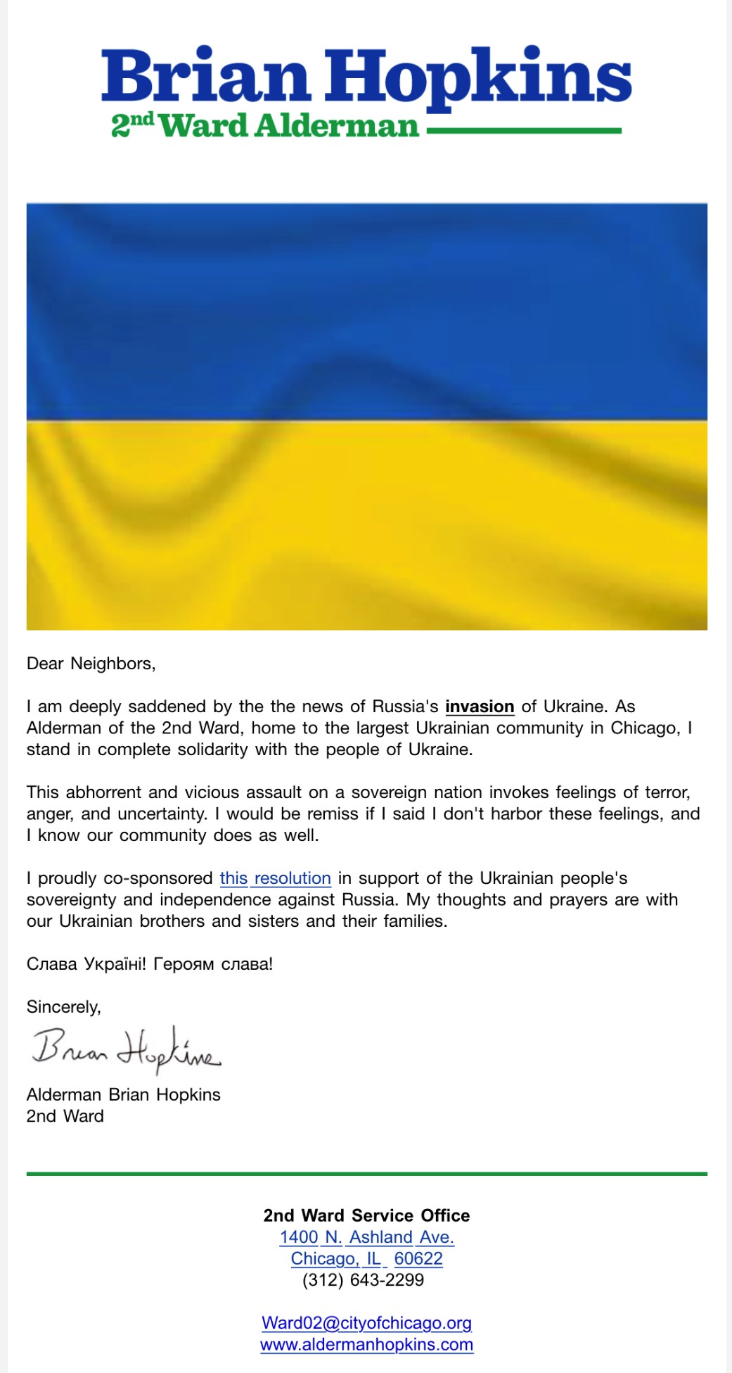 Statement on Behalf of Brian Hopkins, 2nd Ward Alderman, on the War in Ukraine 24 лютого 2022 Перегляди: 4695 Twitter Попередня Наступна